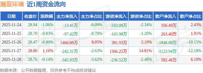 资金流向数据方面,本周瀚蓝环境主力资金合计净流入767.01万元,游资资金合计净流入1002.59万元,散户资金合计净流出1769.6万元。本周资金流向一览见下表: