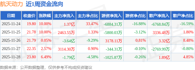 资金流向数据方面,本周航天动力主力资金合计净流出3.51亿元,游资资金合计净流出1.09亿元,散户资金合计净流入4.59亿元。本周资金流向一览见下表:
