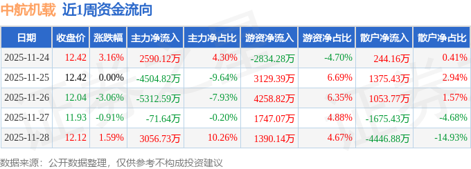 资金流向数据方面,本周中航机载主力资金合计净流出4242.19万元,游资资金合计净流入7691.13万元,散户资金合计净流出3448.94万元。本周资金流向一览见下表: