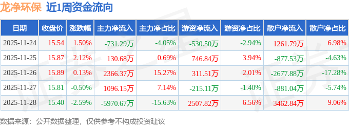 资金流向数据方面,本周龙净环保主力资金合计净流出3108.74万元,游资资金合计净流入2820.55万元,散户资金合计净流入288.19万元。本周资金流向一览见下表: