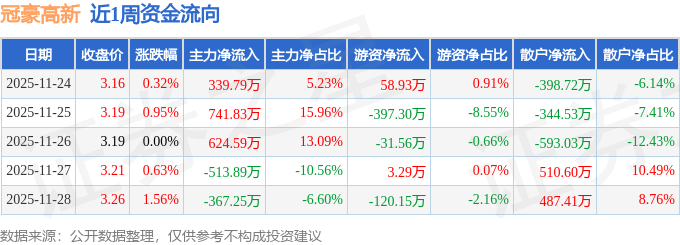 资金流向数据方面,本周冠豪高新主力资金合计净流入825.06万元,游资资金合计净流出486.79万元,散户资金合计净流出338.27万元。本周资金流向一览见下表: