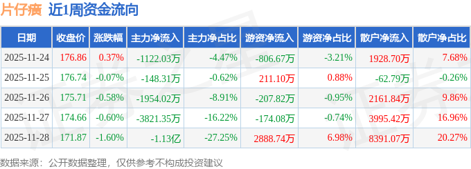 资金流向数据方面,本周片仔癀主力资金合计净流出1.83亿元,游资资金合计净流入1911.27万元,散户资金合计净流入1.64亿元。本周资金流向一览见下表:
