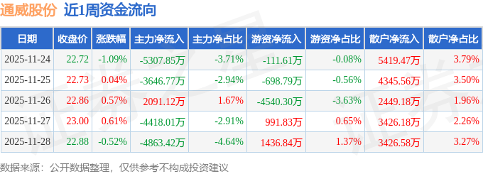 资金流向数据方面,本周通威股份主力资金合计净流出1.61亿元,游资资金合计净流出2922.03万元,散户资金合计净流入1.91亿元。本周资金流向一览见下表: