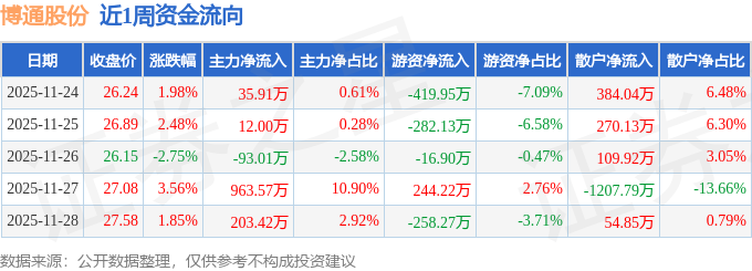 资金流向数据方面,本周博通股份主力资金合计净流入1121.9万元,游资资金合计净流出733.04万元,散户资金合计净流出388.86万元。本周资金流向一览见下表: