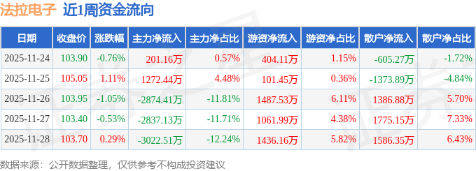 资金流向数据方面,本周法拉电子主力资金合计净流出7260.45万元,游资资金合计净流入4491.23万元,散户资金合计净流入2769.21万元。本周资金流向一览见下表: