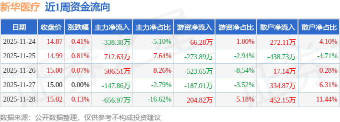 资金流向数据方面,本周新华医疗主力资金合计净流入75.91万元,游资资金合计净流出713.45万元,散户资金合计净流入637.53万元。本周资金流向一览见下表: