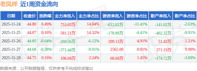 资金流向数据方面,本周老凤祥主力资金合计净流入808.29万元,游资资金合计净流出512.84万元,散户资金合计净流出295.45万元。本周资金流向一览见下表: