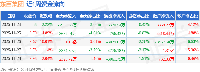 资金流向数据方面,本周东百集团主力资金合计净流出1203.04万元,游资资金合计净流出1.2亿元,散户资金合计净流入1.32亿元。本周资金流向一览见下表: