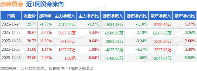 资金流向数据方面,本周赤峰黄金主力资金合计净流入1.33亿元,游资资金合计净流出1.28亿元,散户资金合计净流出464.77万元。本周资金流向一览见下表: