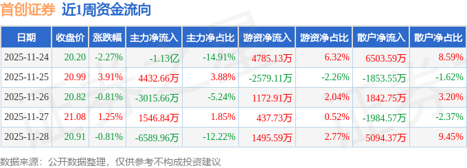资金流向数据方面,本周首创证券主力资金合计净流出1.49亿元,游资资金合计净流入5312.25万元,散户资金合计净流入9602.58万元。本周资金流向一览见下表: