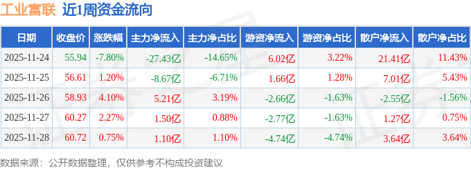 资金流向数据方面,本周工业富联主力资金合计净流出28.29亿元,游资资金合计净流出2.49亿元,散户资金合计净流入30.78亿元。本周资金流向一览见下表: