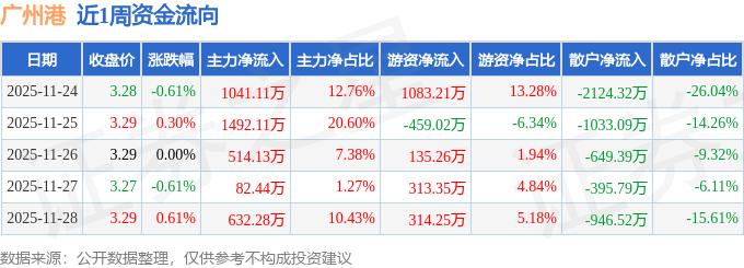 资金流向数据方面,本周广州港主力资金合计净流入3762.07万元,游资资金合计净流入1387.04万元,散户资金合计净流出5149.11万元。本周资金流向一览见下表:
