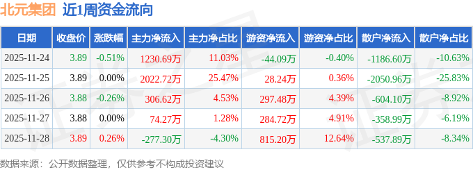 资金流向数据方面,本周北元集团主力资金合计净流入3356.99万元,游资资金合计净流入1381.56万元,散户资金合计净流出4738.55万元。本周资金流向一览见下表: