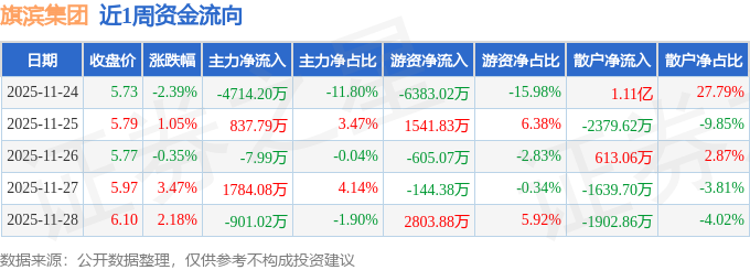 资金流向数据方面,本周旗滨集团主力资金合计净流出3001.34万元,游资资金合计净流出2786.76万元,散户资金合计净流入5788.11万元。本周资金流向一览见下表: