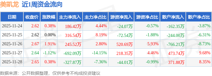 资金流向数据方面,本周美凯龙主力资金合计净流出271.48万元,游资资金合计净流入598.42万元,散户资金合计净流出326.94万元。本周资金流向一览见下表:
