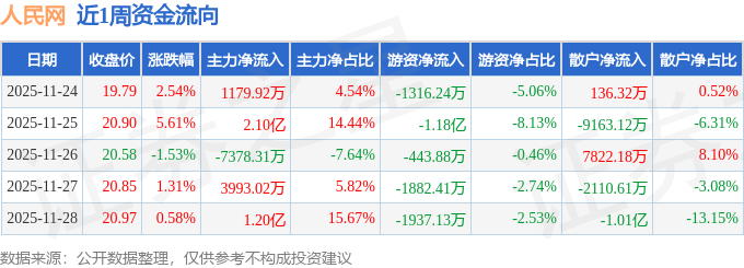 证券之星消息,截至2025年11月28日收盘,人民网(603000)报收于20.97元,较上周的19.3元上涨8.65%。本周,人民网11月25日盘中最高价报21.77元。11月24日盘中最低价报19.21元。人民网当前最新总市值231.86亿元,在数字媒体板块市值排名2/14,在两市A股市值排名807/5168。