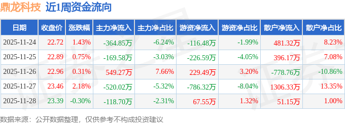 资金流向数据方面,本周鼎龙科技主力资金合计净流出623.88万元,游资资金合计净流出832.35万元,散户资金合计净流入1456.23万元。本周资金流向一览见下表: