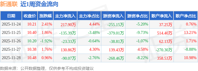 资金流向数据方面,本周新通联主力资金合计净流入99.98万元,游资资金合计净流出802.0万元,散户资金合计净流入702.02万元。本周资金流向一览见下表: