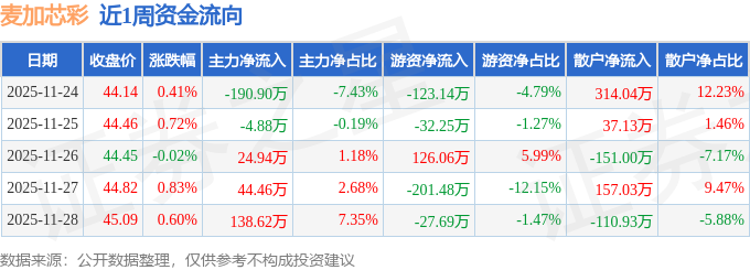 资金流向数据方面,本周麦加芯彩主力资金合计净流入12.24万元,游资资金合计净流出258.51万元,散户资金合计净流入246.27万元。本周资金流向一览见下表: