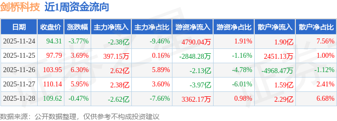资金流向数据方面,本周剑桥科技主力资金合计净流入438.79万元,游资资金合计净流出5.57亿元,散户资金合计净流入5.53亿元。本周资金流向一览见下表: