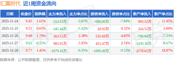 资金流向数据方面,本周汇嘉时代主力资金合计净流出491.06万元,游资资金合计净流出767.4万元,散户资金合计净流入1258.46万元。本周资金流向一览见下表: