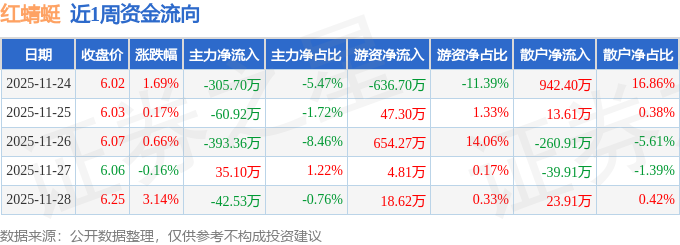 资金流向数据方面,本周红蜻蜓主力资金合计净流出767.42万元,游资资金合计净流入88.31万元,散户资金合计净流入679.11万元。本周资金流向一览见下表: