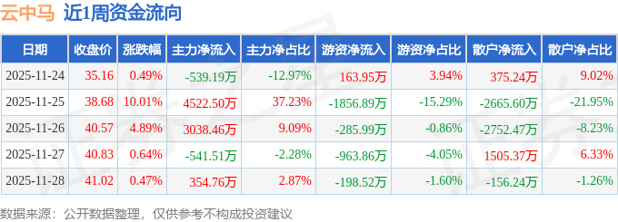 资金流向数据方面,本周云中马主力资金合计净流入6835.01万元,游资资金合计净流出3141.3万元,散户资金合计净流出3693.7万元。本周资金流向一览见下表: