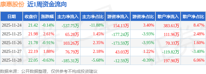 资金流向数据方面,本周康惠股份主力资金合计净流出477.74万元,游资资金合计净流出166.25万元,散户资金合计净流入643.98万元。本周资金流向一览见下表:
