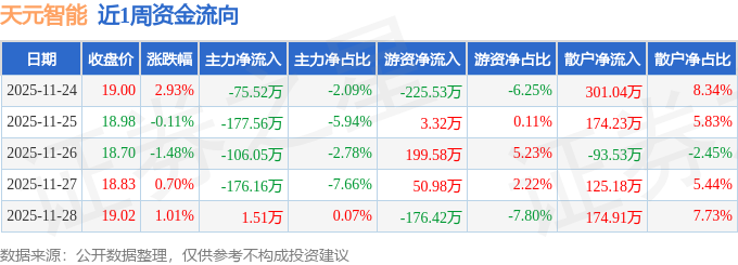 资金流向数据方面,本周天元智能主力资金合计净流出533.77万元,游资资金合计净流出148.06万元,散户资金合计净流入681.83万元。本周资金流向一览见下表: