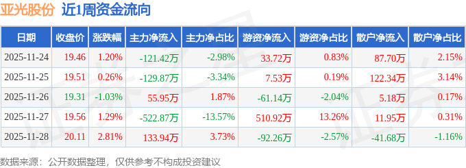 资金流向数据方面,本周亚光股份主力资金合计净流出584.27万元,游资资金合计净流入398.78万元,散户资金合计净流入185.49万元。本周资金流向一览见下表: