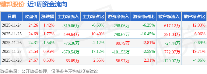 资金流向数据方面,本周键邦股份主力资金合计净流出502.22万元,游资资金合计净流出1033.5万元,散户资金合计净流入1535.72万元。本周资金流向一览见下表: