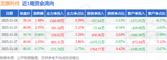 资金流向数据方面,本周龙旗科技主力资金合计净流入2845.78万元,游资资金合计净流入277.0万元,散户资金合计净流出3122.78万元。本周资金流向一览见下表: