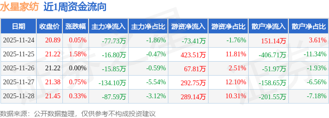 资金流向数据方面,本周水星家纺主力资金合计净流出332.07万元,游资资金合计净流入999.81万元,散户资金合计净流出667.74万元。本周资金流向一览见下表: