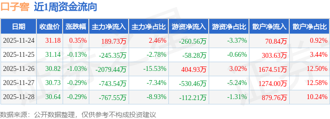 资金流向数据方面,本周口子窖主力资金合计净流出3646.15万元,游资资金合计净流出556.59万元,散户资金合计净流入4202.74万元。本周资金流向一览见下表:
