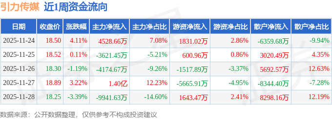 资金流向数据方面,本周引力传媒主力资金合计净流入801.23万元,游资资金合计净流出3108.36万元,散户资金合计净流入2307.13万元。本周资金流向一览见下表: