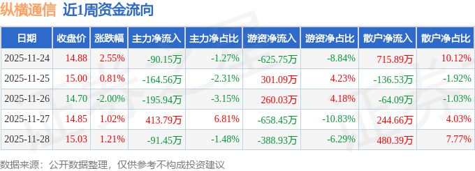 资金流向数据方面,本周纵横通信主力资金合计净流出128.31万元,游资资金合计净流出1112.01万元,散户资金合计净流入1240.33万元。本周资金流向一览见下表: