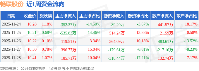 资金流向数据方面,本周畅联股份主力资金合计净流出186.21万元,游资资金合计净流入291.08万元,散户资金合计净流出104.86万元。本周资金流向一览见下表: