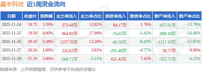 资金流向数据方面,本周晨丰科技主力资金合计净流入2759.95万元,游资资金合计净流入296.98万元,散户资金合计净流出3056.93万元。本周资金流向一览见下表: