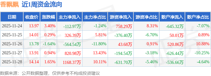 资金流向数据方面,本周香飘飘主力资金合计净流入1638.22万元,游资资金合计净流出400.67万元,散户资金合计净流出1237.55万元。本周资金流向一览见下表: