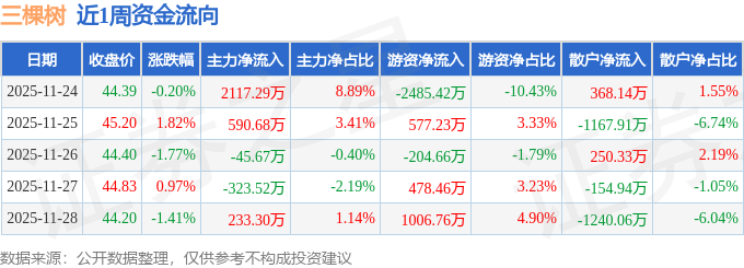 资金流向数据方面,本周三棵树主力资金合计净流入2572.08万元,游资资金合计净流出627.63万元,散户资金合计净流出1944.45万元。本周资金流向一览见下表: