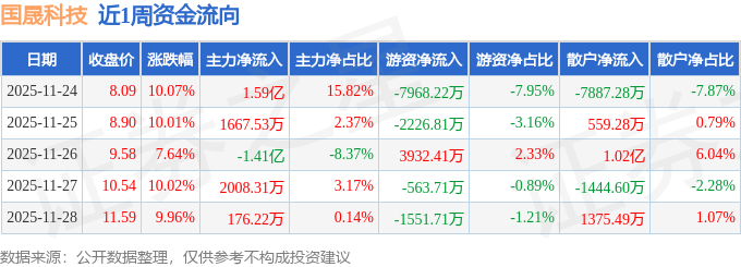 资金流向数据方面,本周国晟科技主力资金合计净流入5596.65万元,游资资金合计净流出8378.04万元,散户资金合计净流入2781.39万元。本周资金流向一览见下表: