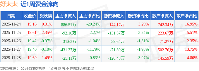 资金流向数据方面,本周好太太主力资金合计净流出1466.72万元,游资资金合计净流出218.9万元,散户资金合计净流入1685.62万元。本周资金流向一览见下表: