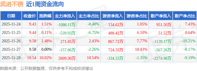 资金流向数据方面,本周武进不锈主力资金合计净流入1097.64万元,游资资金合计净流入1880.75万元,散户资金合计净流出2978.4万元。本周资金流向一览见下表: