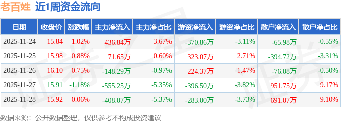 资金流向数据方面,本周老百姓主力资金合计净流出603.12万元,游资资金合计净流出502.92万元,散户资金合计净流入1106.04万元。本周资金流向一览见下表: