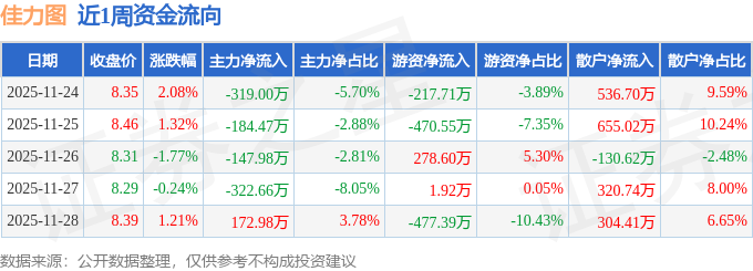 资金流向数据方面,本周佳力图主力资金合计净流出801.13万元,游资资金合计净流出885.12万元,散户资金合计净流入1686.25万元。本周资金流向一览见下表: