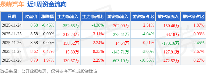 资金流向数据方面,本周泉峰汽车主力资金合计净流入164.66万元,游资资金合计净流出805.59万元,散户资金合计净流入640.92万元。本周资金流向一览见下表: