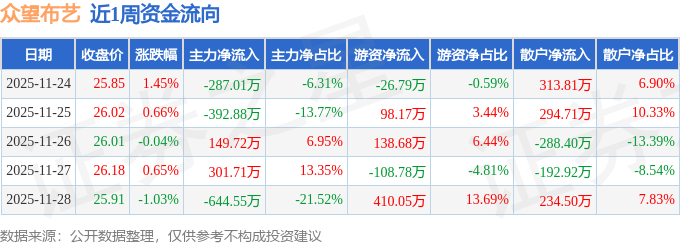 资金流向数据方面,本周众望布艺主力资金合计净流出873.02万元,游资资金合计净流入511.33万元,散户资金合计净流入361.7万元。本周资金流向一览见下表: