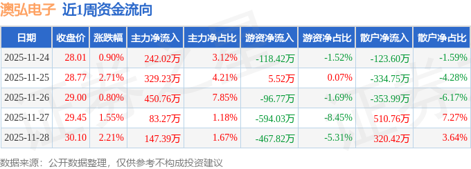 资金流向数据方面,本周澳弘电子主力资金合计净流入1252.68万元,游资资金合计净流出1271.52万元,散户资金合计净流入18.84万元。本周资金流向一览见下表: