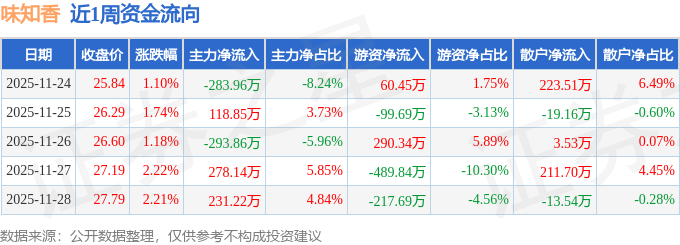 资金流向数据方面,本周味知香主力资金合计净流入50.39万元,游资资金合计净流出456.42万元,散户资金合计净流入406.04万元。本周资金流向一览见下表: