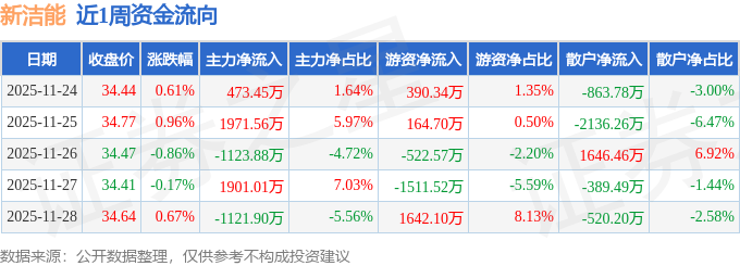 资金流向数据方面,本周新洁能主力资金合计净流入2100.24万元,游资资金合计净流入163.03万元,散户资金合计净流出2263.27万元。本周资金流向一览见下表: